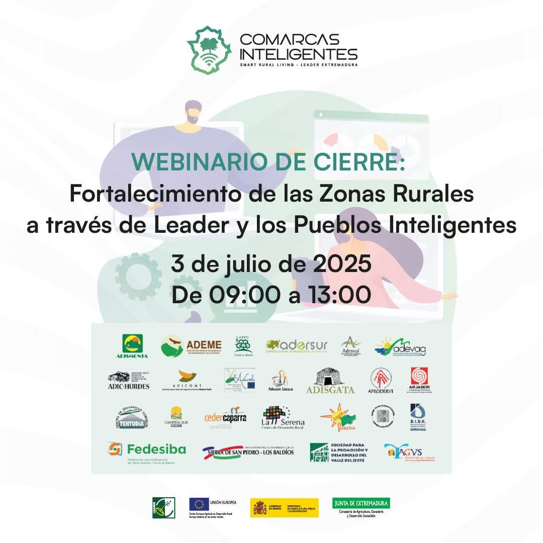 El jueves 03 de julio de 2025 se celebrará el Webinario de cierre FORTALECIMIENTO DE LAS ZONAS RURALES A TRAVÉS DE LEADER Y LOS PUEBLOS INTELIGENTES, en formato online, de 09:00 a 13:00 horas.
